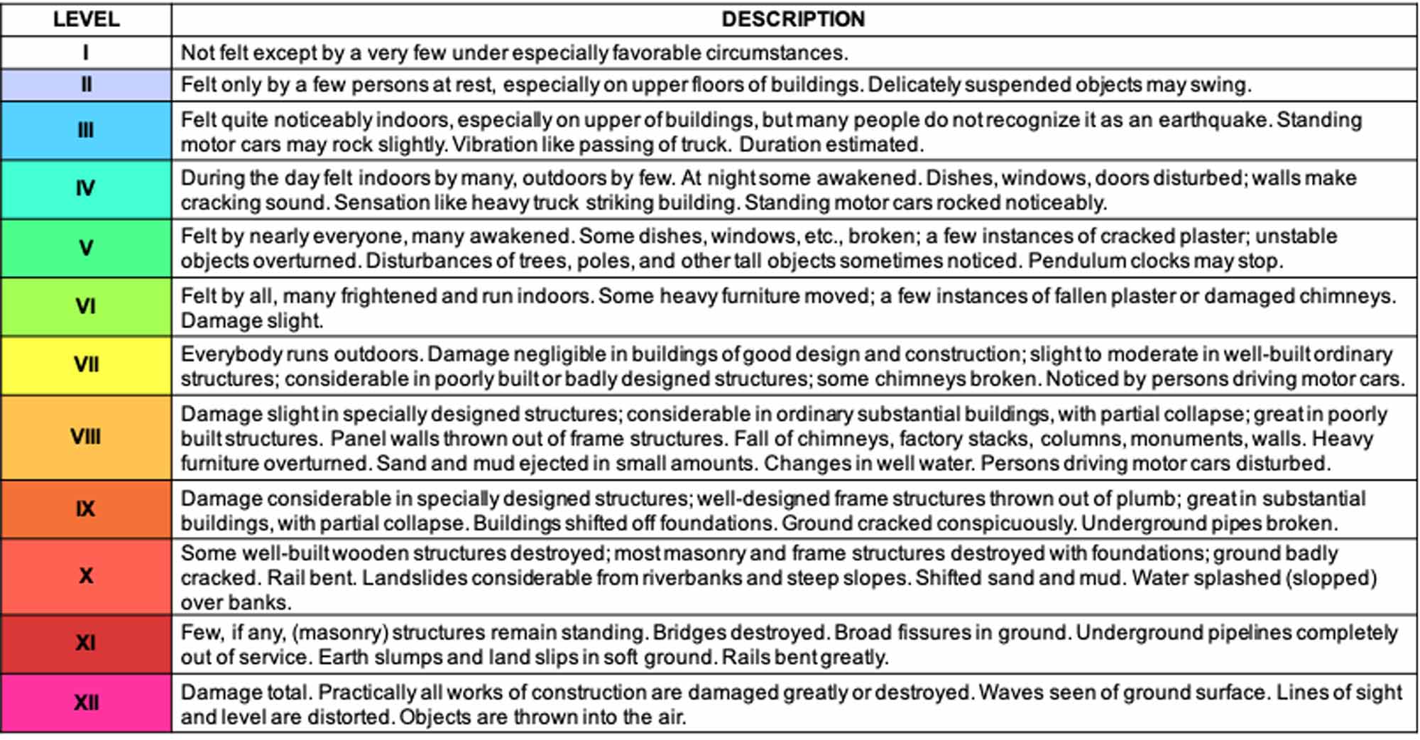 The Modified Mercalli Intensity Scale provides scientists with a method to quantify the shaking generated by an earthquake, as experienced at any point at the earth’s surface. The scale was developed at the turn of the century by the Italian volcanologist G. Mercalli, and subsequently revised by American seismologists H.O. Wood and F. Neumann in the 1930s. It is a 12-point scale, ranging from sites that experience barely perceptible vibration (MM I) to those that experience total devastation (MM XII). Note that the scale is based on vibration experienced at a particular site. Thus, in contrast to the Richter Magnitude scale, which assigns a single value to represent the overall size of an earthquake, the intensity values for a given quake range from site to site.